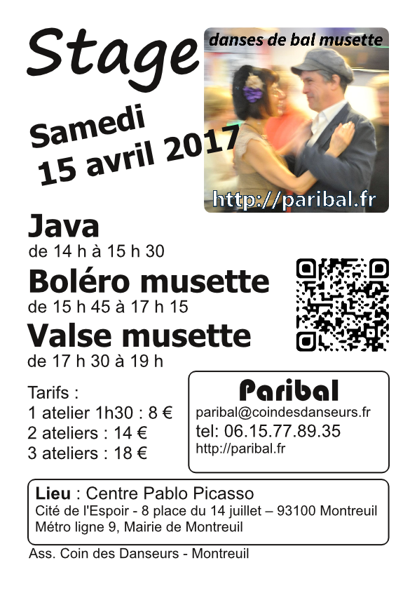 Au cours de cet atelier nous aborderons le style bien particulier : le musette parisien. Un style propre aux dancings de la région parisienne encore pratiqué par une poignée de vétérans et qu’il ne faudrait pas oublier. Il est construit à partir des « petits pas ».